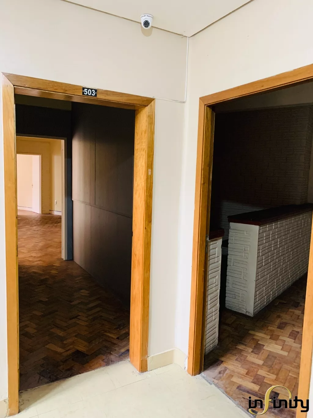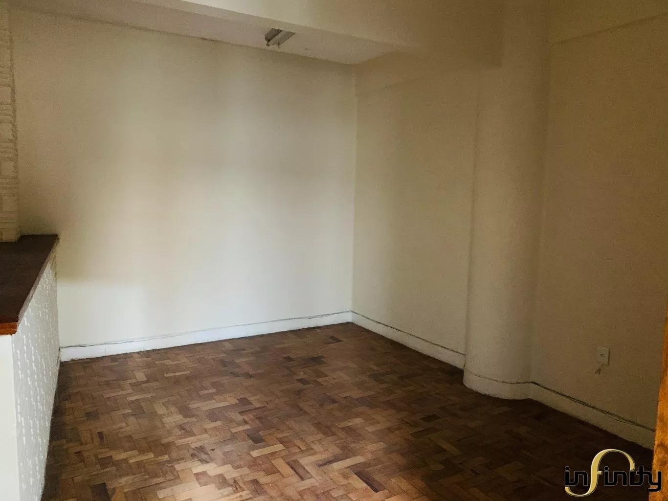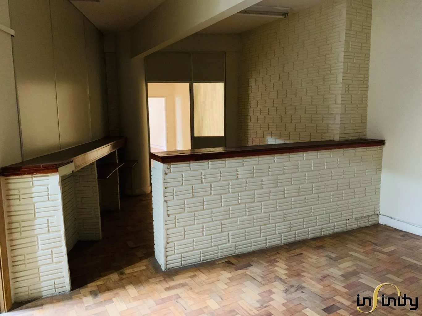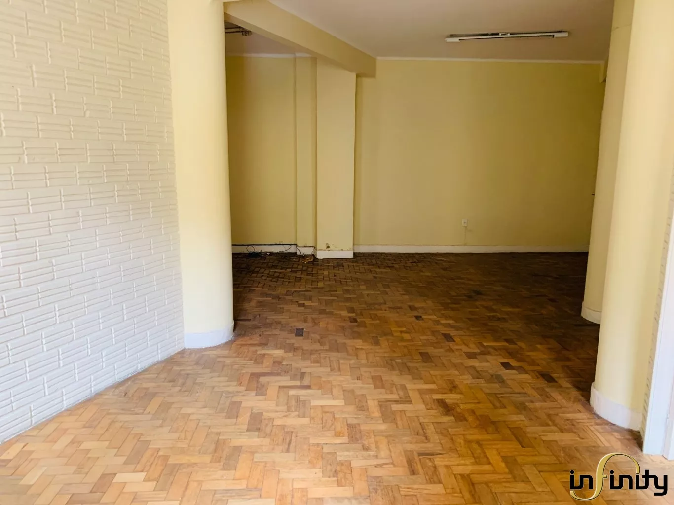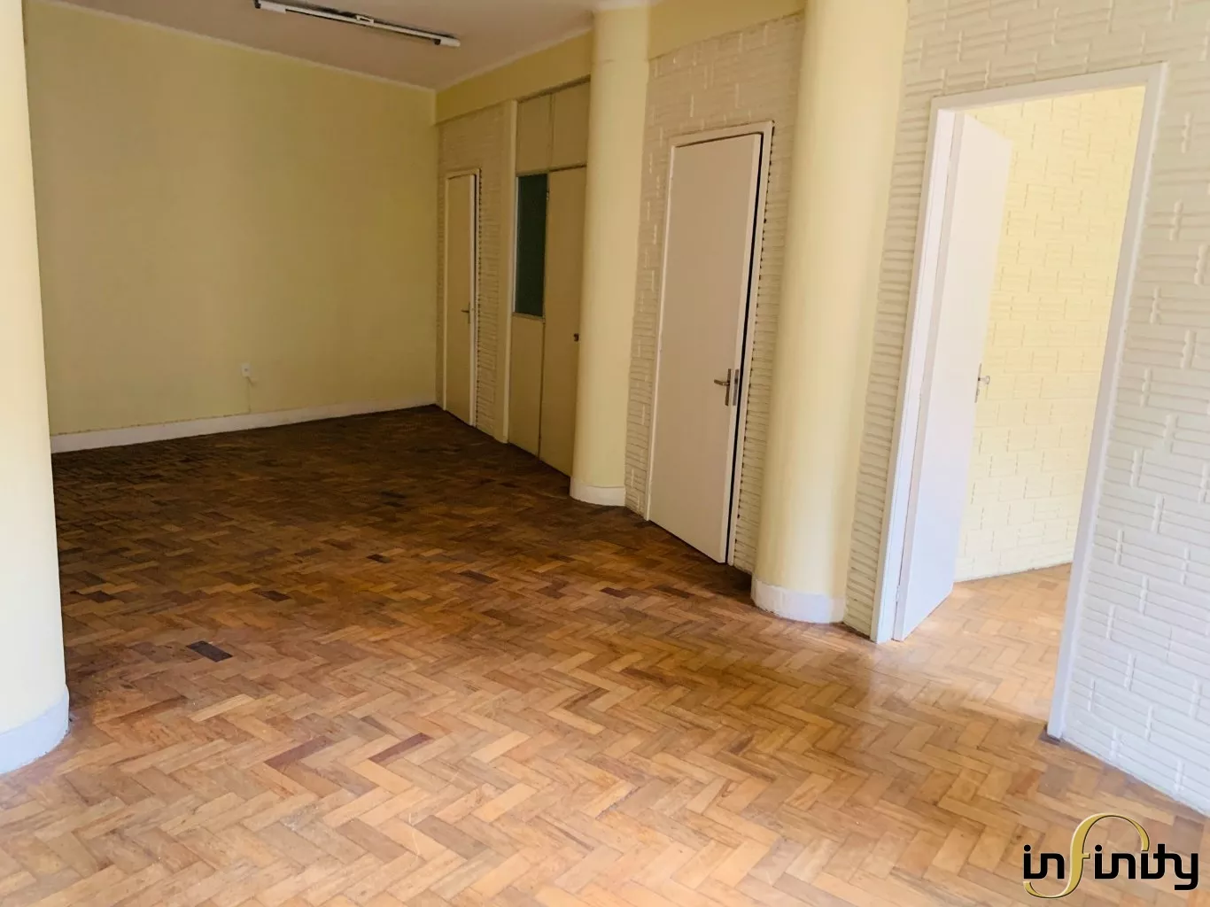 Ampla sala, com duas entradas e espaço para hall, conta com bastante iluminação natural e diversas divisas de ambientes. Possui cozinha e banheiro privativos.